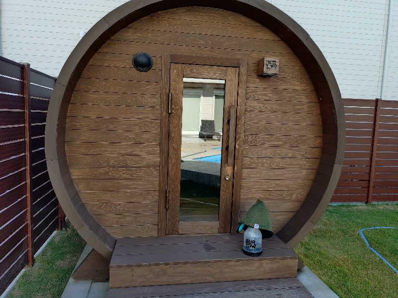 バレルサウナは熱回りが早く、結構熱くて楽しめる。出たらそのまま目の前のプールに飛び込めます。