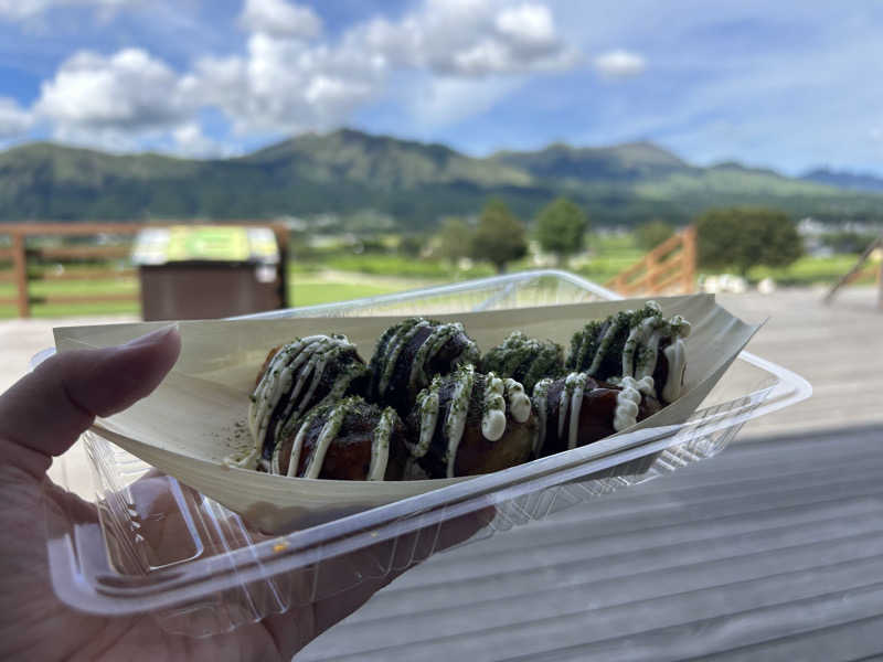 サ飯悩んで、どうしようううと思ったけど結局道の駅のたこ焼きと阿蘇の飲むヨーグルトという意味のわからん組み合わせになった。