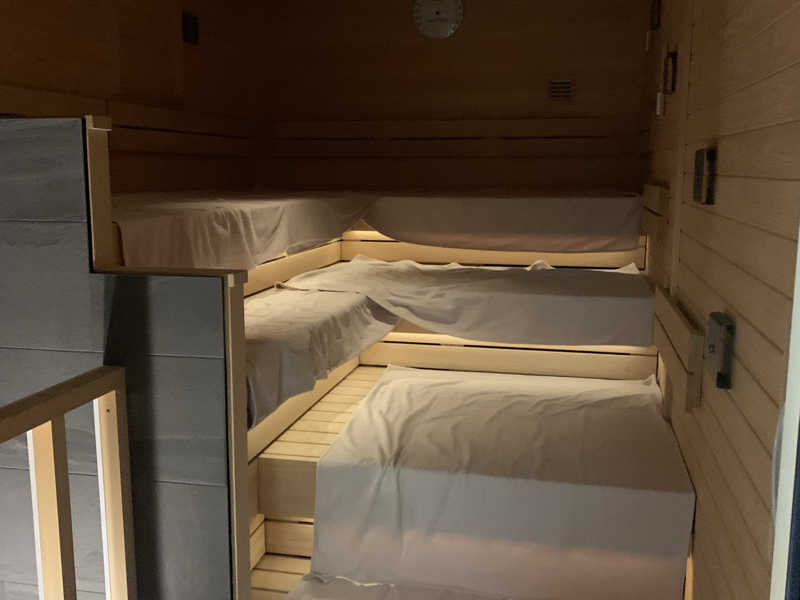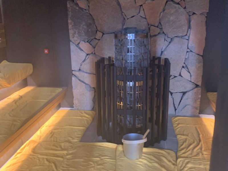 きれいで良いサ室です。座面の温度測ってみましたが84度。私史上4位の強いサ室で、20分はギリギリでした。ロウリュウもやれば直ぐに熱波は届きますが、ストーブ少し高すぎませんか?ロウリュウの時、少し危ない様な感じもします。