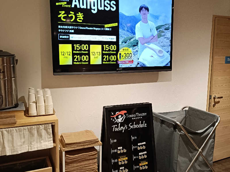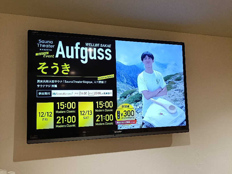 月サウナのセルフロウリュは、ぶら下がってるボールに水を入れ、ラドルでボールを揺らす。太陽サウナは、今までの、サウナで一番大きいテレビかなと思うほど、大きいテレビが、セットされてる。