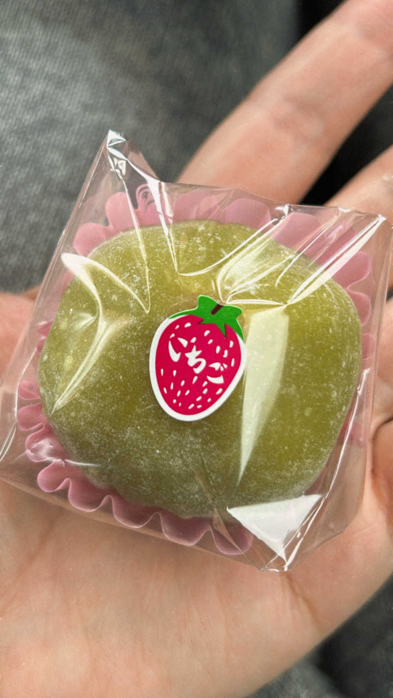 ピスタチオ餅に白あんと四つ星苺が包まれています