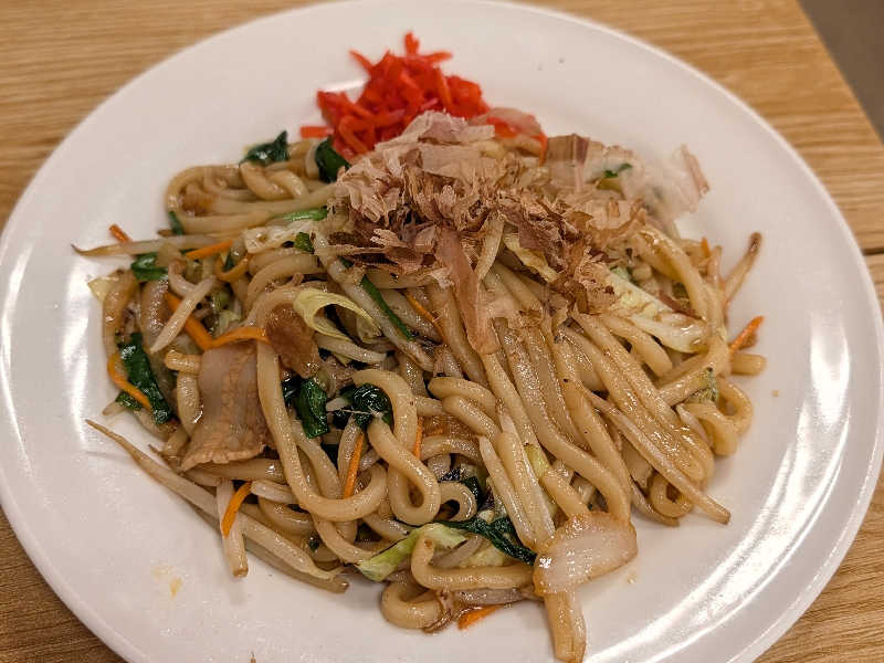 シャワーで清めたら食堂へ向かい焼きうどんを食べる