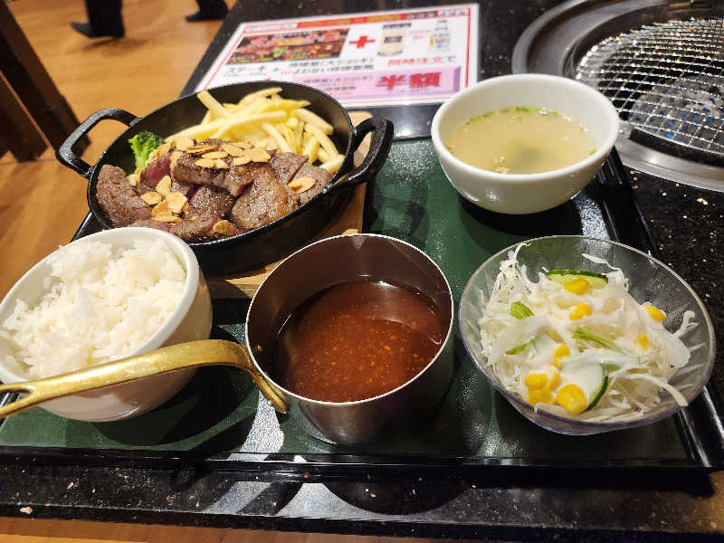 久しぶりのステーキ。若鶏、盛岡冷麺も追加。👋😵🍴