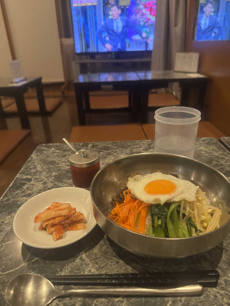 男女完全別なので、休憩室・ご飯場所も別。こういうシステムなのですね、ふむふむ興味深い🤔 一緒にきたサウナ仲間の男性達と2時間後に合流してご飯しよーと言ってましたが、男性エリアには侵入はできそーにないです。 私は、女子参加一人なので、中盤でバスローブ借りて、休憩&ビビンバいただきました🍲🍹