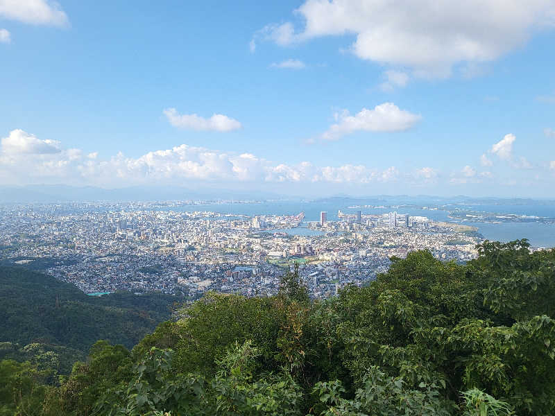 最上段のラフマにて都市高環状線越しの博多湾を見る。