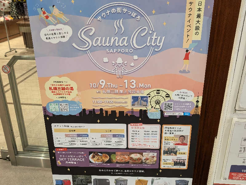 その後、バスで札幌駅に移動し徒歩で三越へ。今回のサ旅のメインイベント、札幌三越の屋上でやってるサウナの街さっぽろのイベントに参加したのです。臨時のイベントだからかサウナイキタイのサ活投稿ができなさそうだったので、たまゆらとあわせて書きます。