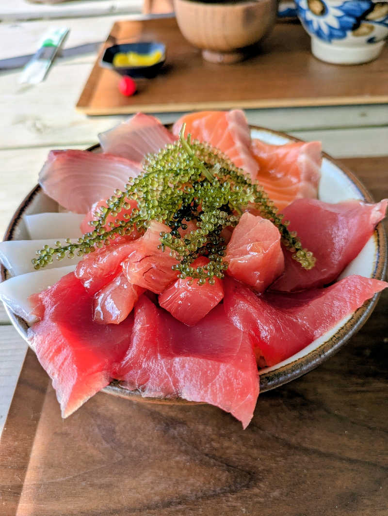 junjunさん、こちらにもコメントありがとうございます🤗 この日は半袖で過ごせる位お天気が良く、海も穏やかでキラキラ輝いておりました🌊✨️ 贅沢丼、仰る通り海ぶどうです👍久しぶりに食べましたが、ぷちぷち食感で美味でした😋