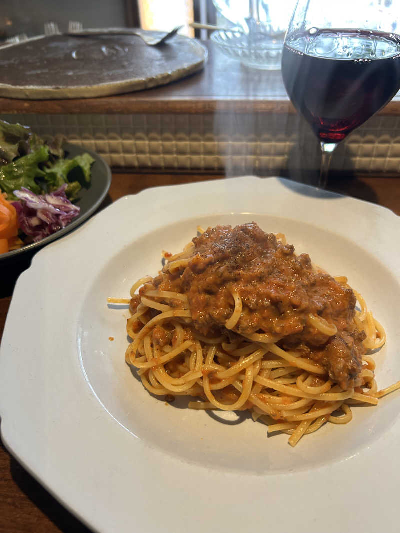 私はミートソースパスタと赤ワイン🍷デザートはイチジクのクグロフ