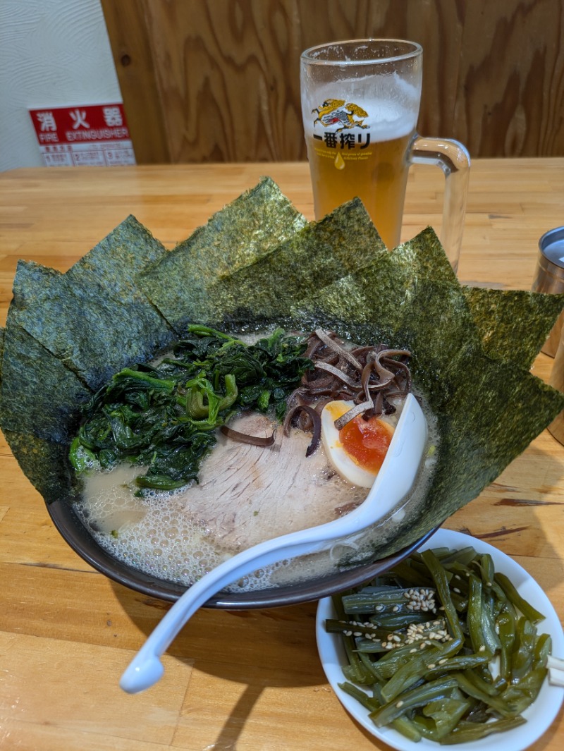 今日もこちらへ♨️✨ ドライ5、スチーム1 お風呂が少しぬるめで気持ちよかった(´⚰︎`)♨️✨ サ飯はNeo家系らーめん 實家 塩豚骨🍜 茎わかめ&海苔&ほうれん草TP いつも1人なのにテーブルにしてくれてありがとうございます😊女性に優しいお店✨でも中身はおっさんなのでカウンターでいいですよ🤣笑
