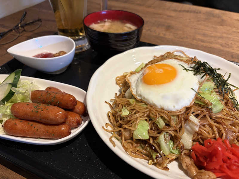 食堂では焼きそばとソーセージを生ビール2杯で流し込む