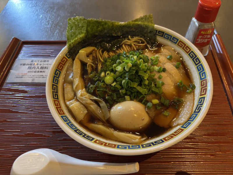前回は言わないと出て来なかった、昼食を館内で食べると1時間延長無料キャンペーンカードが、今回は特製醤油ラーメンと共にお盆に載せられて提供されました。
