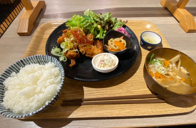 ずっと食べてみたかった唐揚げ定食、唐揚げのサクッと具合がベストで、しかもサラダとけんちん汁も美味しすぎた。