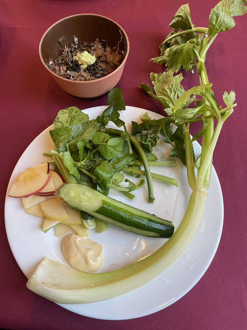 朝も4時から入ることができ、朝食は安曇野の有名なわさびやクレソン、セロリなどをむしゃむしゃ食べることができ、とっても素敵なモーニングビュッフェがあります^_^