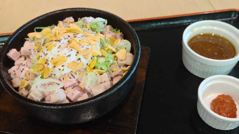 上からガーリックソースをかけてロウリュする、石焼ビビンバ風の豚丼。おこげも楽しめる。