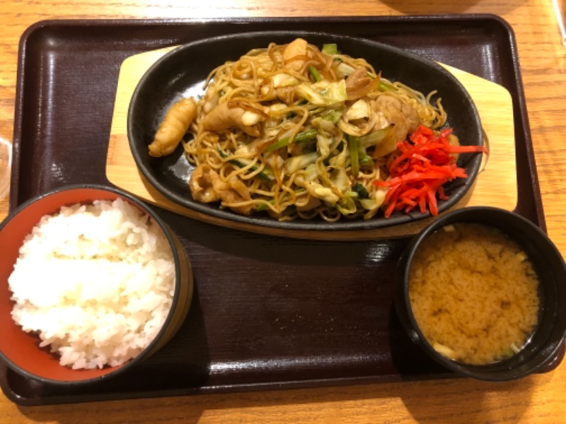 お食事は、今週のサウナ飯のホルモン焼きそば!ご飯もついてくる。炭水化物に炭水化物😂私はダイエット中につき、ご飯はカツカレーを頼んだ夫に寄付しました(笑)