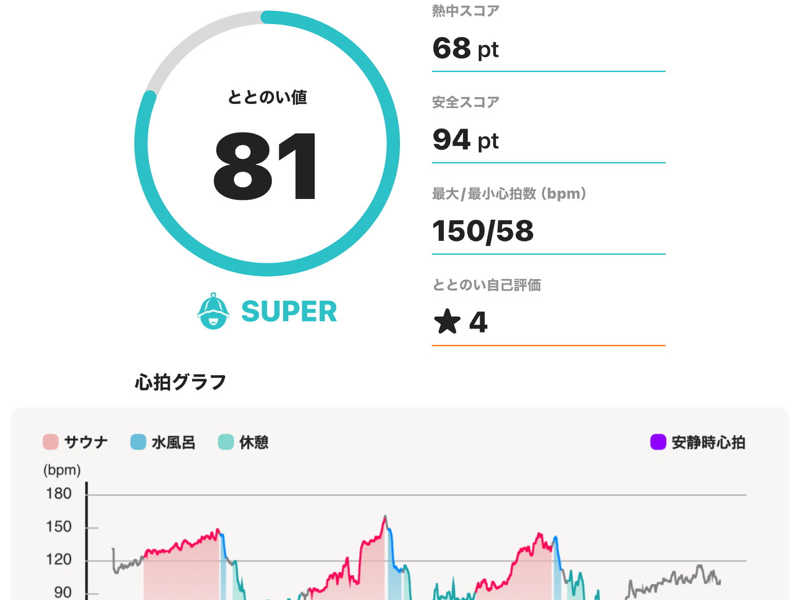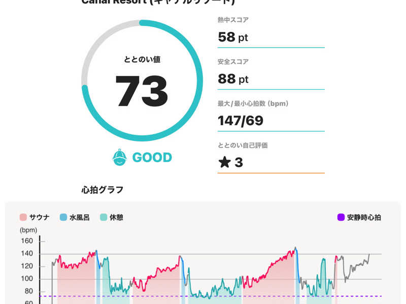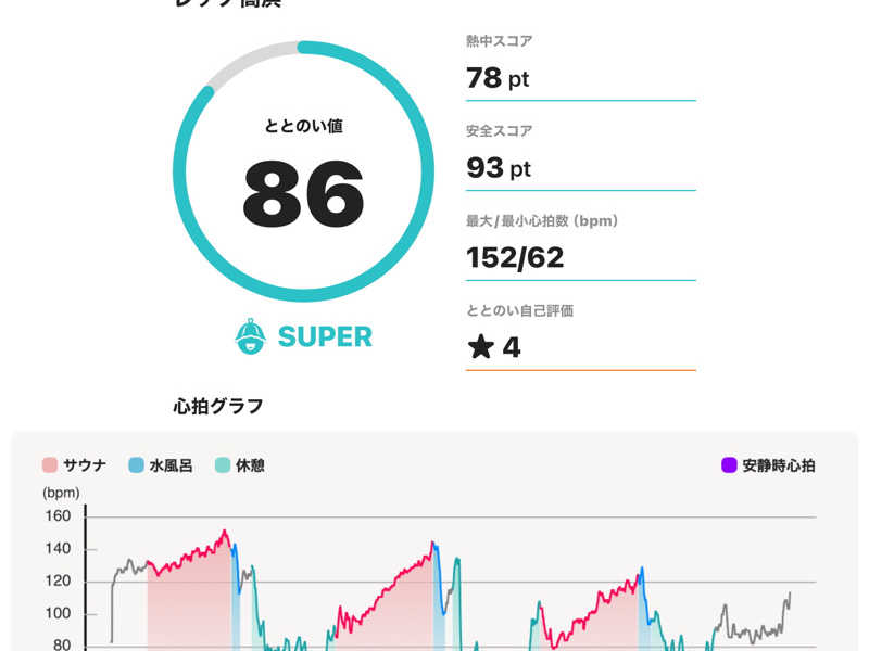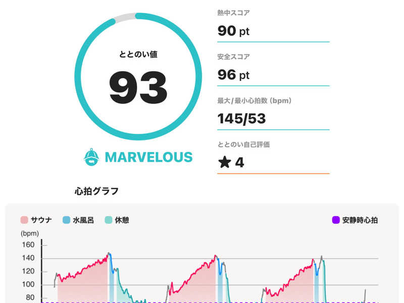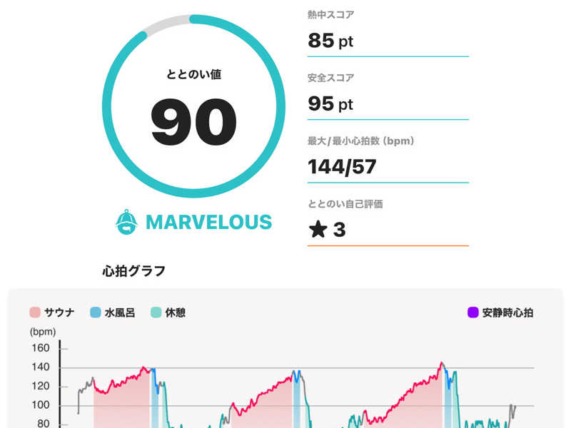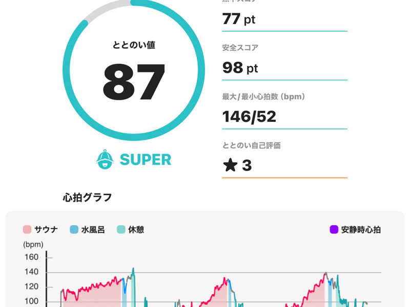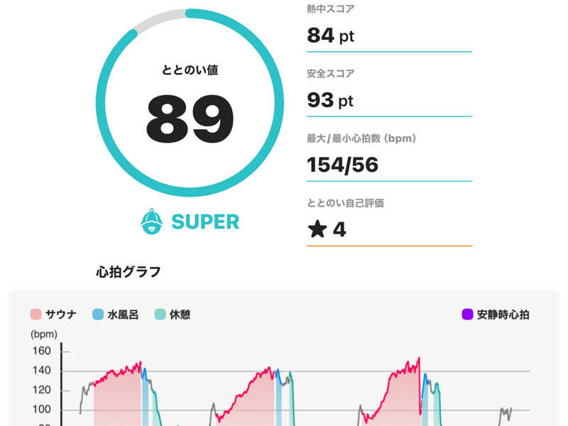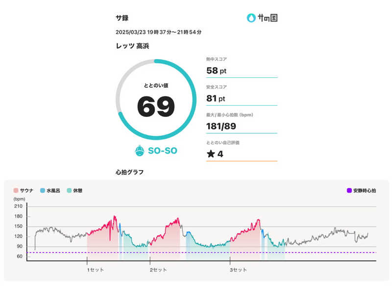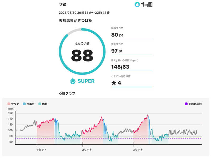 サウナ:10分 × 3 水風呂:1分 × 3 休憩:10分 × 3 合計:3セット 一言:初サウォッチでテンションあがりがち