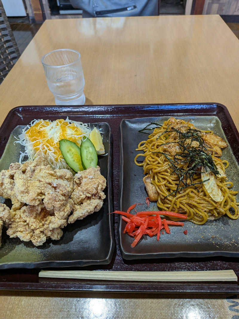 お食事処で焼きそばと鶏の唐揚げを美味しく頂きました✨