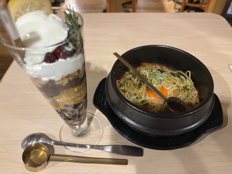 迷った挙句、ごま油をロウリュできる熱々サウナ納豆パスタと、ミントシロップをロウリュできるサウナパフェを注文!