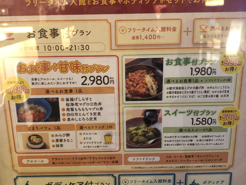 おふろカフェ会員のフリータイム利用(館内着つき・レンタルタオルなし)で、食事代含めておおよそ3000円くらいで満喫できました!