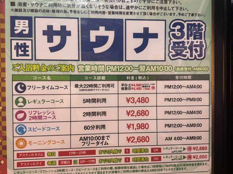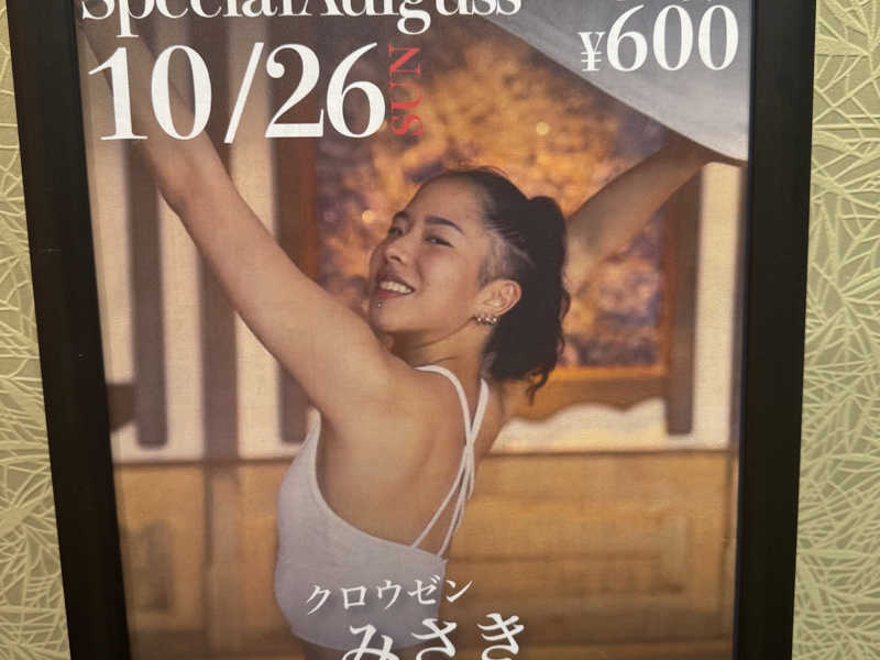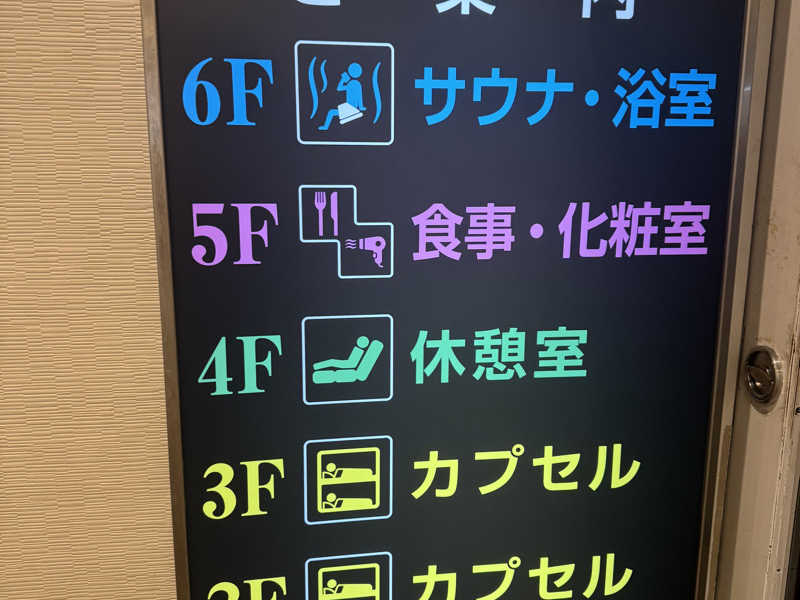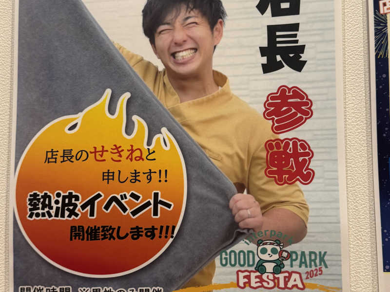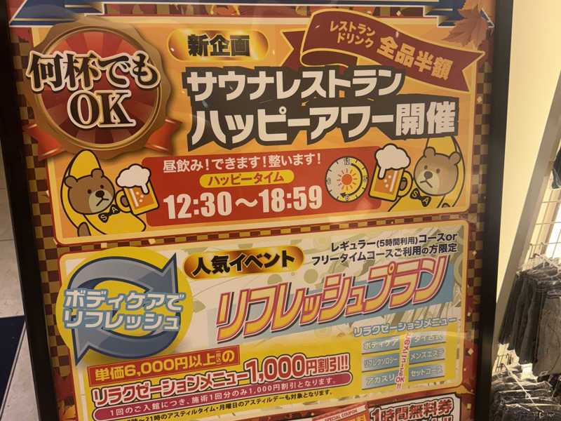 14時30分in!思ってたよりめちゃめちゃ施設自体が広くフロントはホテルかのような清潔感があり、サウナに入る前からもう良い所だと分かる。日曜日は2時間の料金で5時間入れるからかなりお得だ。サウナは通常のサウナとミストサウナがあり、気休めにミストサウナに入ったらとてもいい感じになった。整い椅子も十分が数があり、日曜なので混んでいると思ったが施設が広めなので窮屈感を全く感じなかった。通常のサウナ室は湿度と温度のバランスがとてもよく入ってて心地よいサウナで良かった。サウナそのもさん(井上さん)のアウフグースも受けた。正面に座ってたからなのか何度も水分補給大丈夫ですかと声を掛けられた笑 タオルを振る姿は豪快でまさにサウナそのものだった。全員に何度も水分補給の確認をしてるのは16年間やってきたプロだからこその気遣いなのかと思った。そのままアウフグースを受けて退店。今日もトトノッタ。