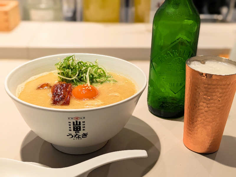 ロビーで無料ドリンクを飲んで漫画を読み、行きに前を通って気になっていたうなぎラーメン店へ。