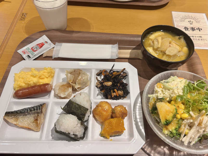 朝5時に起きて朝風呂。 軽めにストーンサウナ12分、ドライサウナ7分2セットでおわらせて小雨の降る中露天風呂を楽しみました。 朝ごはんのビュッフェでモリモリ食べてチェックアウトするまで一眠り🐷💤