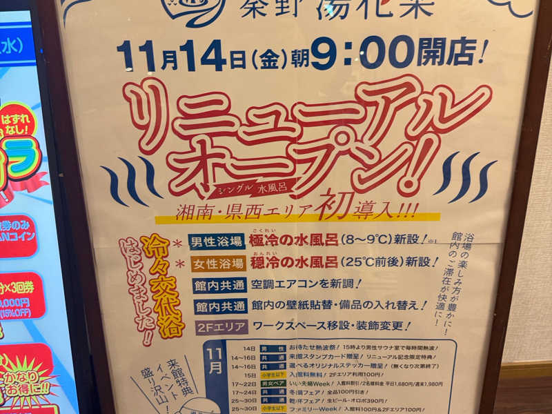 一言:またリニューアルした湯花楽に行きました。6度くらいの水風呂(一人用)が出来ました。