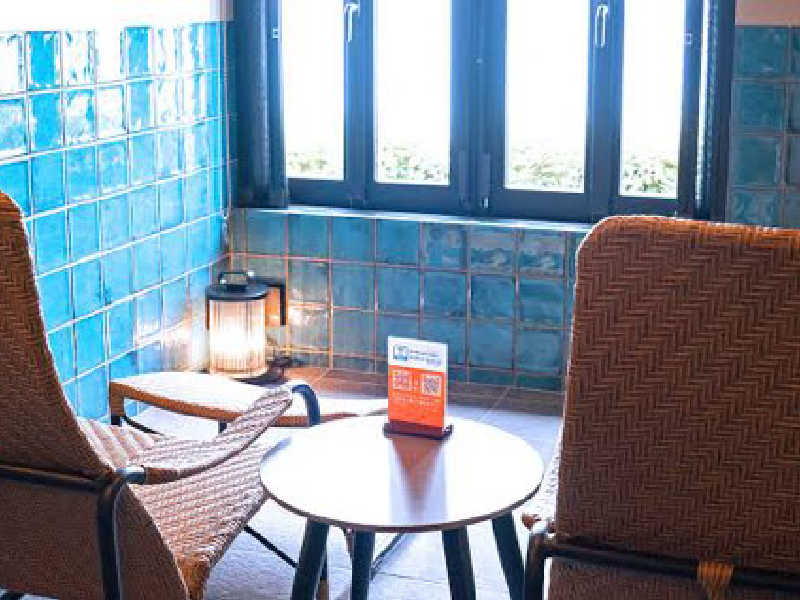 ラタンソファにくつろぐスペース。プライベートサウナとはいえ、数分前にも布で寝ている人がいるのかと思うとソファはあまり好きではない為、個人的にはこれに関しては正直微妙だった。露天風呂が併設されていて、サウナに入る前に海を見ながら温まることができるのでそこは良かった。