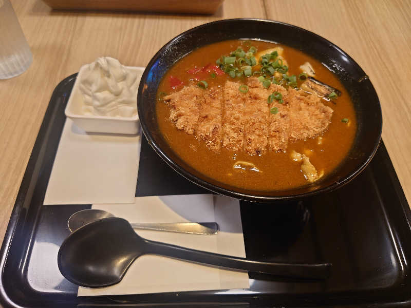 ロースカツのボリュームがメインでプラス豚バラ肉・福神漬・ネギが入っている 辛さ調和のソフトクリー厶有