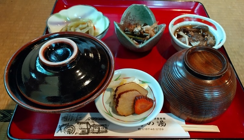 サ昼めし、鶴の湯の別館「山の宿」の庵(いおり)で山の芋鍋定食。お膳に米とお新香と山菜の小鉢3品。囲炉裏に鍋という高級ランチ。1,550円。鍋は約3杯分の量。ごっちゃんです(´(ェ)`)