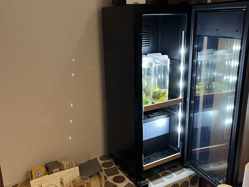 浴場までの通路にベンチとデトックス水、ドライフルーツ、チョコ、塩飴。