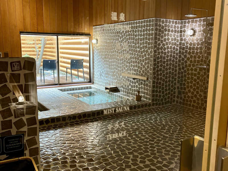 通路からドアを隔てて浴場。ミストサウナとドライサウナ、温泉浴槽、水風呂、テラス。ガウンやバスタオルを仮置くスペースがある。