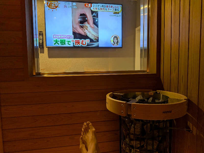 こちらはテレビありの一般的なサウナだけれど座席がゆるくカーブしていて室内は広く開放感があって良き。