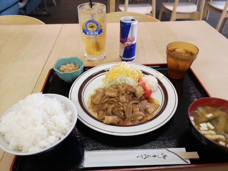 館内着に着替え👘急いでレストランへ🍴🏃~ラストオーダーギリギリに🕥しょうが焼定食と🐷ブルポを🥤頂きました😋