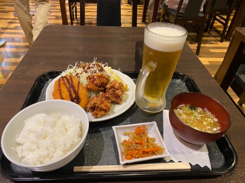 サウナ後は唐揚げコロッケ定食!美味かった。