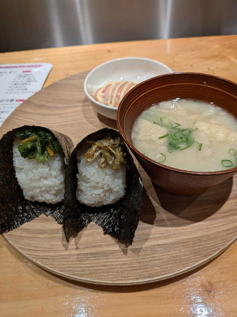 あサ飯は一汁三鉢でおにぎり(野沢菜こんぶ&ザーサイ高菜マヨ)とハムエッグと豚汁最高ウマイ。