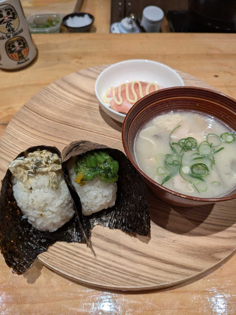 朝から一汁三鉢でおにぎり食べて水春。
