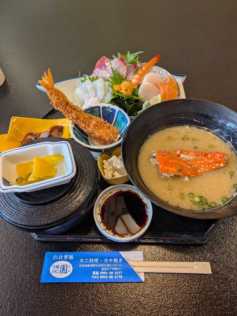 サウナ上がりに早めのお昼ごはんを蟹御殿から車で2分の『竹崎かに園』で刺身定食をいただく。