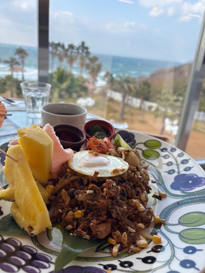 レストランでナシゴレンたべて 入浴半額でイン レストラン、景色サイコー サウナ8分5セット中、3セットソロ SAWO社のタワーヒーターに ロウリュウしながら とにかく空いてるのがいいところです