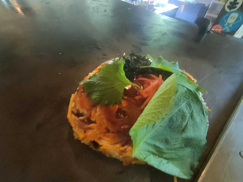 サウナ後はお好み焼き頂きましょう。目の前で焼いてもらいながら、のぶサウナ探訪記の始まり始まり〜