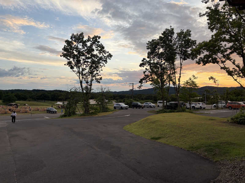 写真は受付から見える併設のキャンプ場の景色とコースに合わせていただいた日本酒。